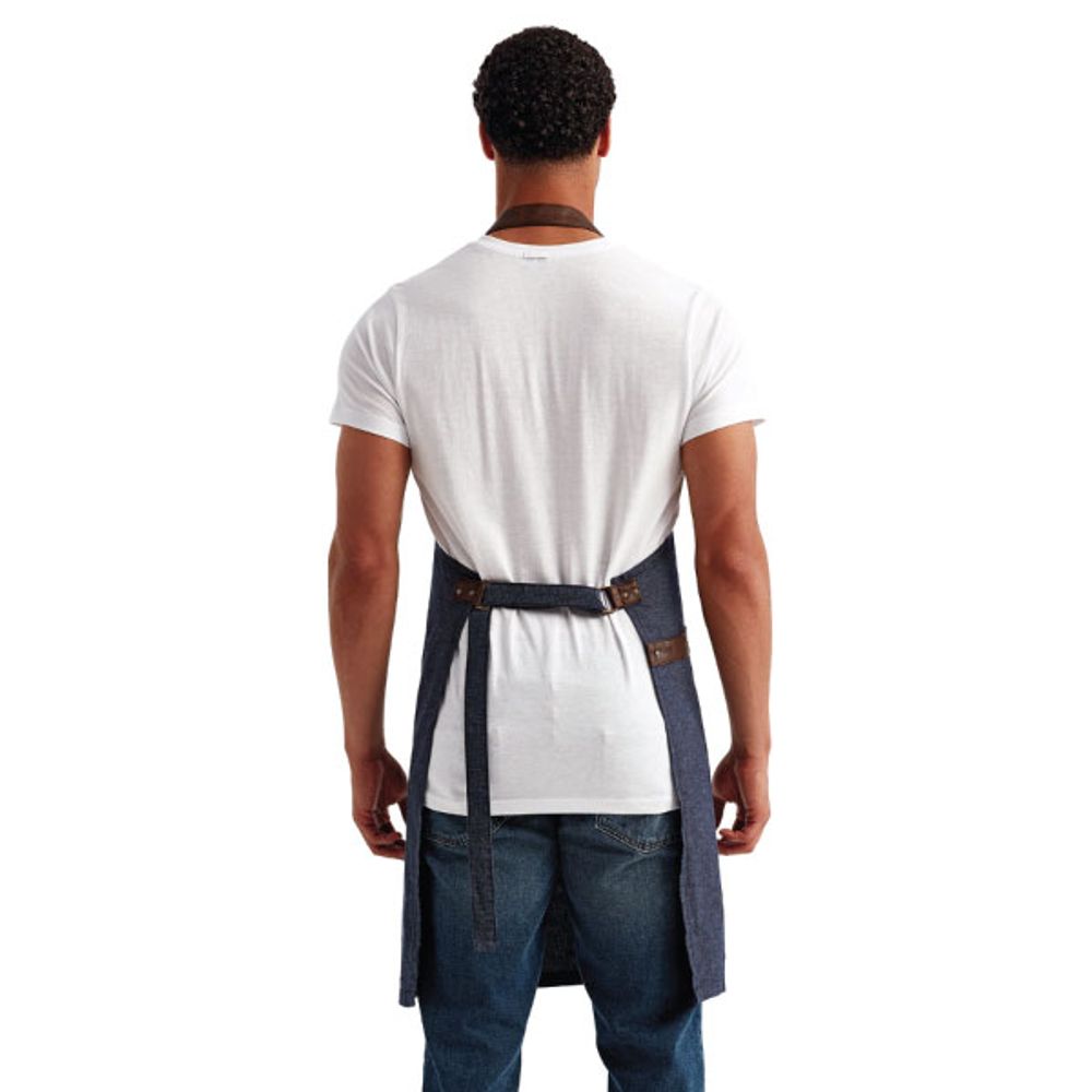 With a faux leather neckband, this bib apron by the Artisan Collection is stylish as well as practical. Features a center, tablet-friendly pocket with a combined pen pocket. Has side tabs with rivet details. Neckband has height adjusting buckle. Made of 8-ounce, 100% cotton yarn dyed oxford weave.