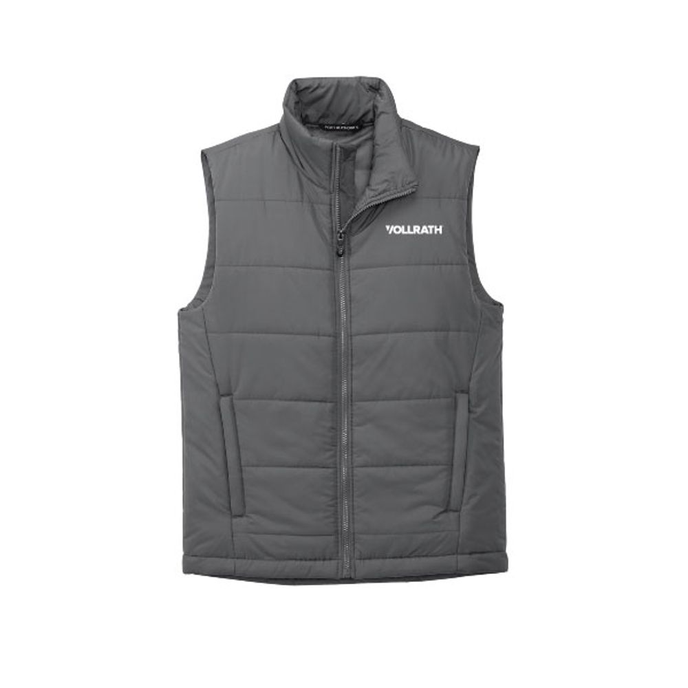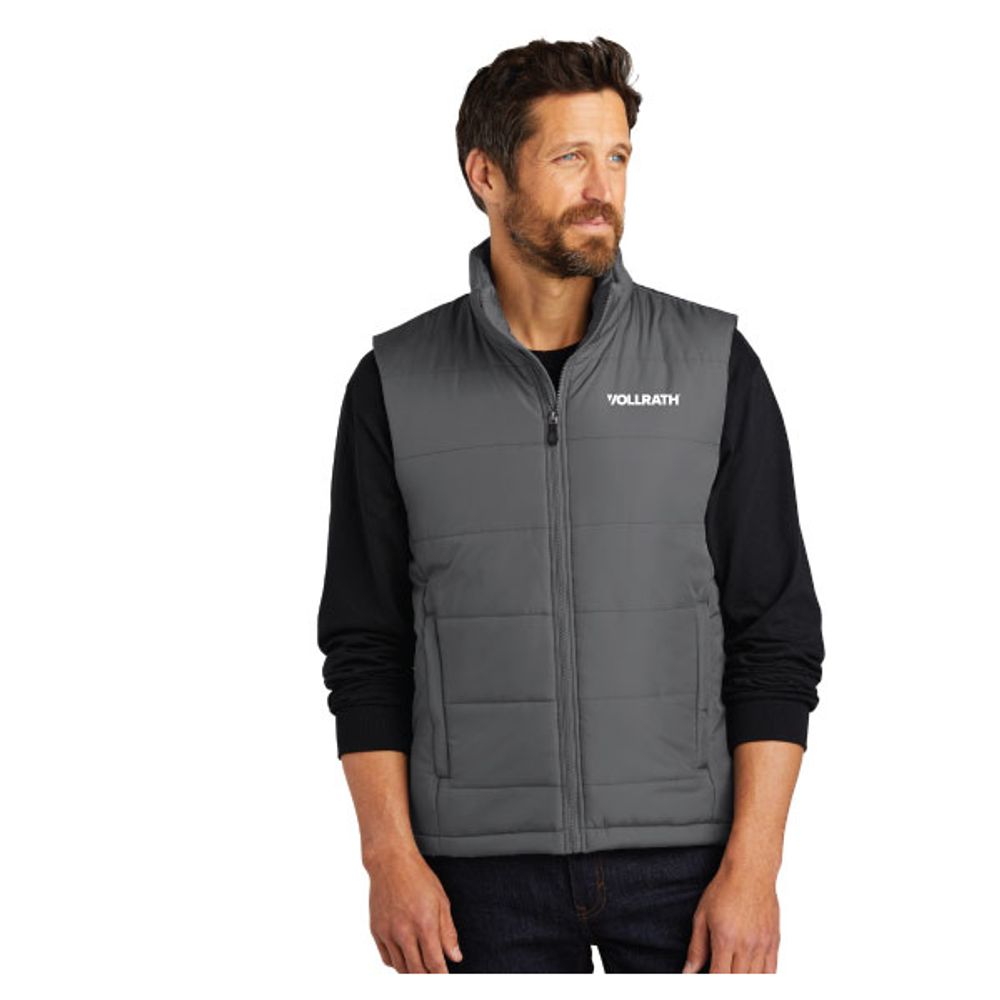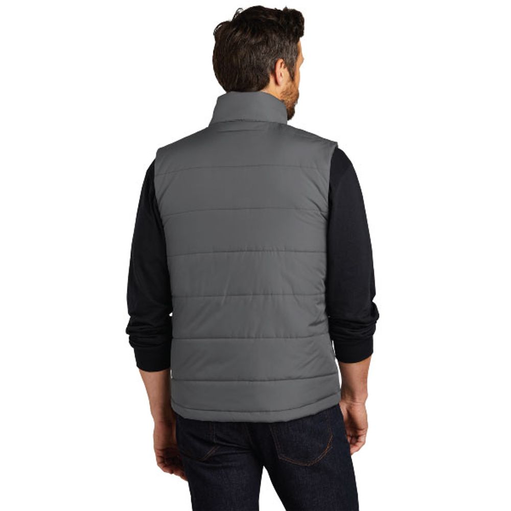 This water-resistant puffer vest combines warmth with a modern edge, featuring wider baffles for a stylish look. Constructed with a 100% polyester shell and lining, it includes a molded front zipper and interior storm flap. Insulated with 4.4-ounce polyfill for added warmth.